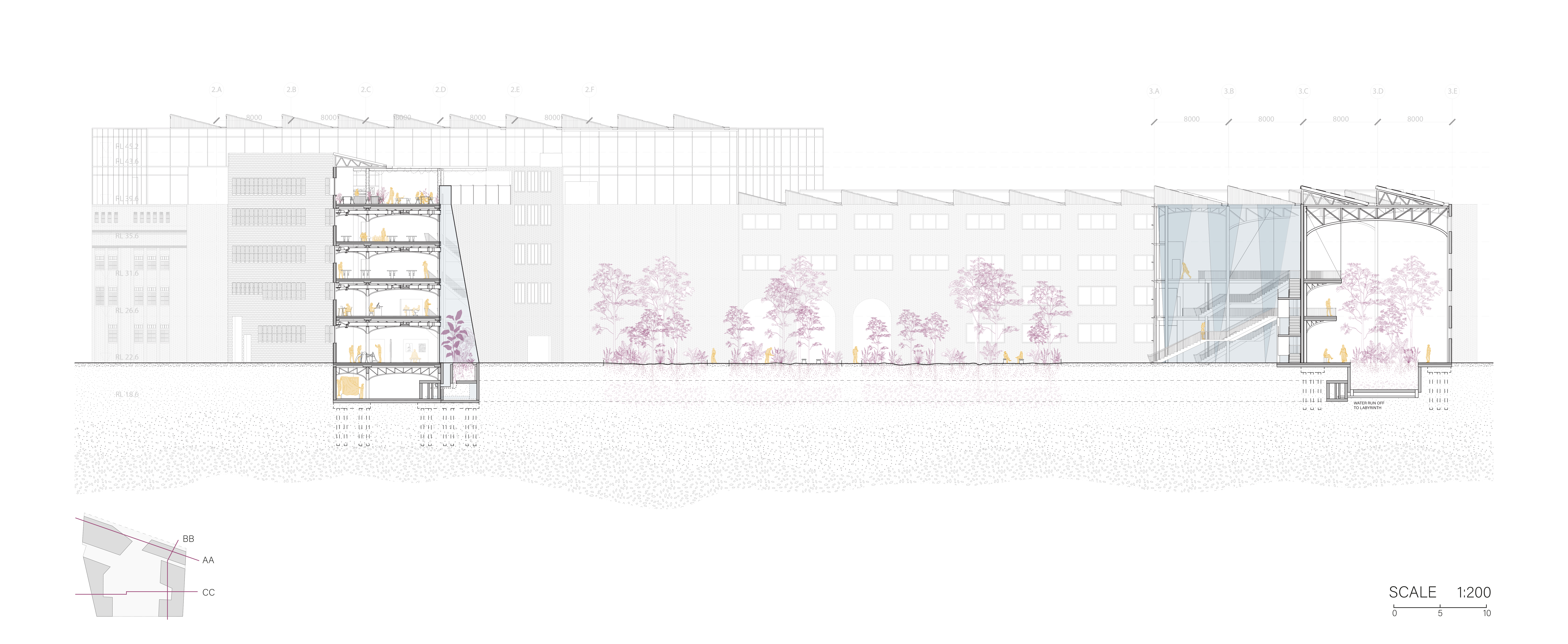 The primary focus of the architecture is to connect people and plants by housing visitors and fauna within an adapted glass production factory, extending the community’s ability to undertake research and conservation, whilst providing spaces to operate educational activities and present exhibitions. In doing so, our proposal, ‘Plant It Forward’ will generate a succinct regreening network that will rejuvenate the Eastern Suburbs Banksia Scrub and Estuarine and Freshwater Wetlands ecologies, In addition, a considered ArtDeco approach will be undertaken to acknowledge the heritage aspects of the existing fabric whilst ensuring the site will comply and sympathise with the demands of contemporary society.
