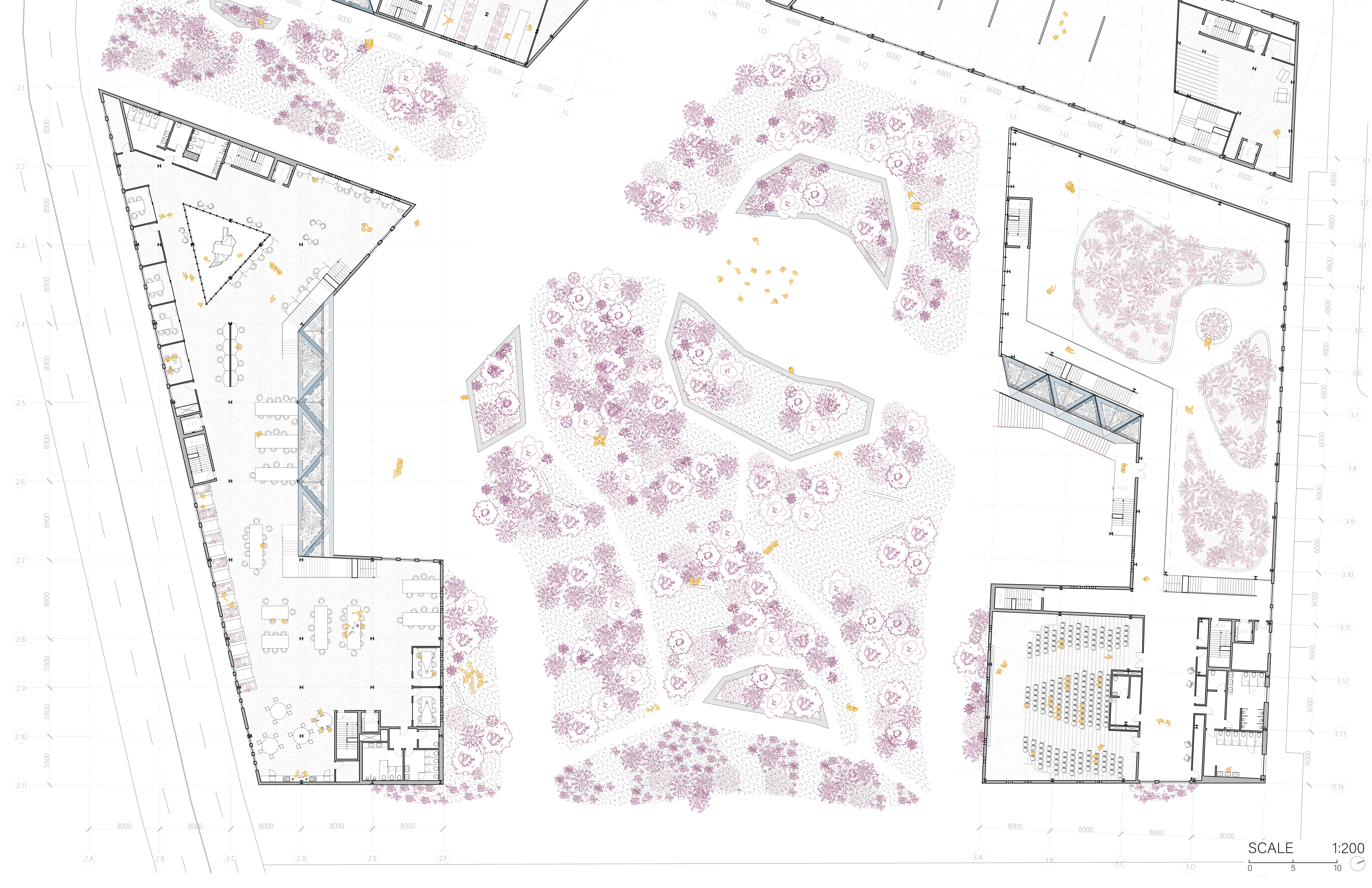 The social condenser will further support commercial opportunities that promote green and sustainable initiatives by providing commercial and coworking spaces for businesses. Through this, the site boundary becomes more porous, encouraging the exchange and collection of knowledge where relationships can be fostered within the broader precinct. Our urban condition was framed similarly to Bernard Tschumi’s Parc de la Villette, where architectural and ecological features have been implemented sympathetically to manage the speed and flow of inhabitants maneuvering through a space. ‘Plant it Forward’ aims to achieve this on the precinct level, down to the individual room, offering different moments of education and participation both on and off-site.