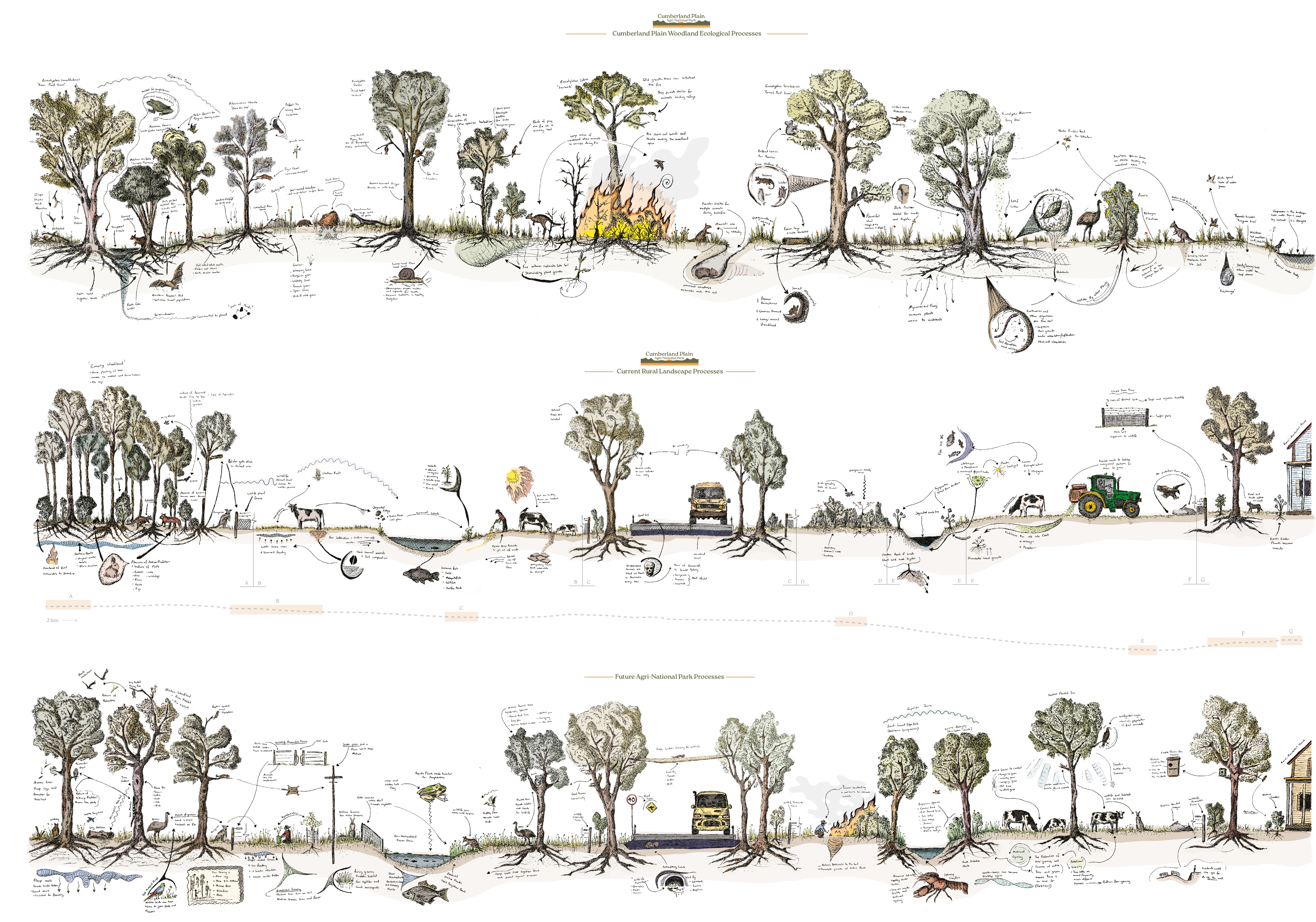 Guided by an agri-environment scheme (AES), the project provides financial incentives to farmers to adopt conservation practices, turning them into stewards of the landscape. In conjunction with the pilot site, this offers a scalable model for the entire region of the South-West Cumberland Plain, envisioning that this landscape can be protected from major developments and form the Cumberland Plain Agri-National park.