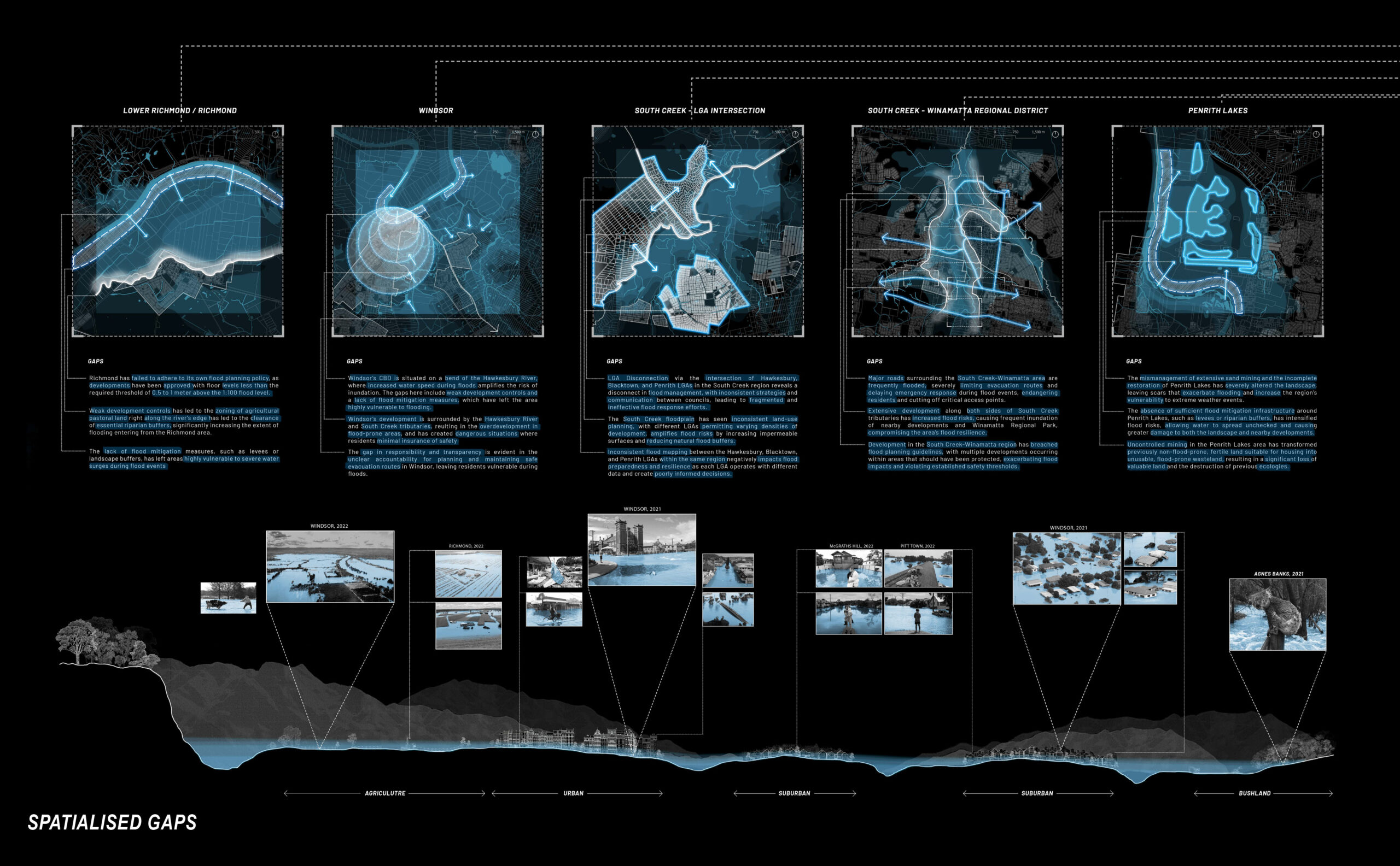 Despite the significance of the remaining Cumberland Plain landscape and ecologies, policy and planning decisions continue to prioritise urban expansion and resource extraction over long-term environmental resilience. Symptomatically, the short-term trade-offs accelerate the landscape’s decline, compromising both its ecological and human capacity to adapt to climate change. In the increased occurrence of climatic extremes, flood waters do not discriminate, nor conform to local government boundaries, yet the response and management of these events are fragmented as each LGA operates in silos. The lack of flood management exacerbates the dysfunction and jeopardises the landscape and the communities that rely on it.