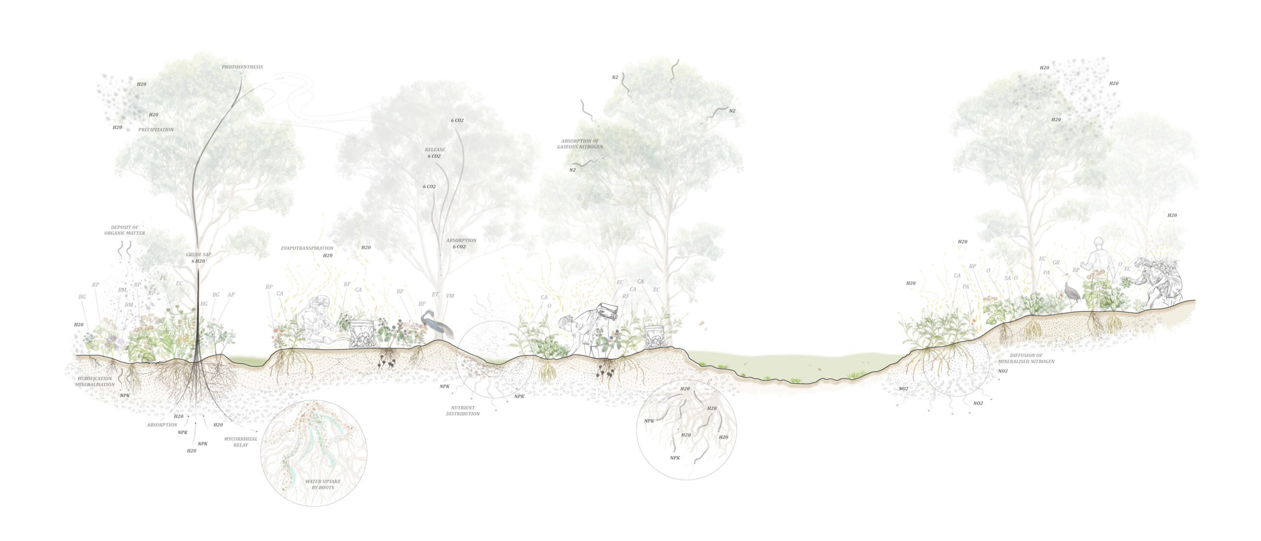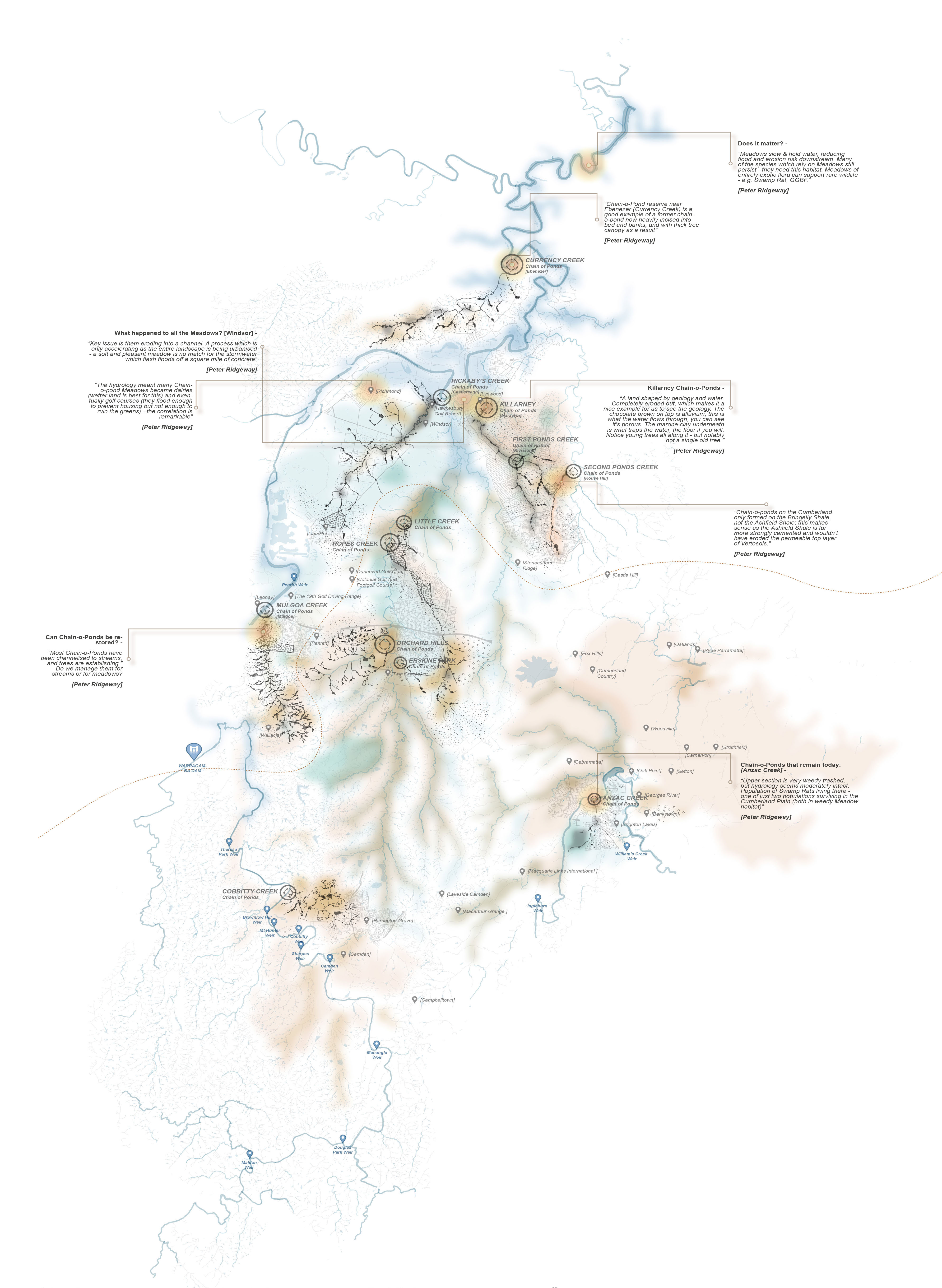 The project aims to address historical and temporal land practices which repeatedly fail to acknowledge the deeper nature of the chain-of-ponds systems. As a part of this, it includes a transparent design process, communicating the gaps within its methodologies and recommendations for further research projects. Drawing from the extensive field work and ecological learnings from Peter Ridgeway, Team Leader for Biodiversity at Greater Sydney Local Land Services, “The forgotten landscapes” proposes three strategies for resilient land management. The strategies apply not only to the human populations living in Sydney’s western plains, but also to non-human species as well as ecological forces in play within the landscapes.