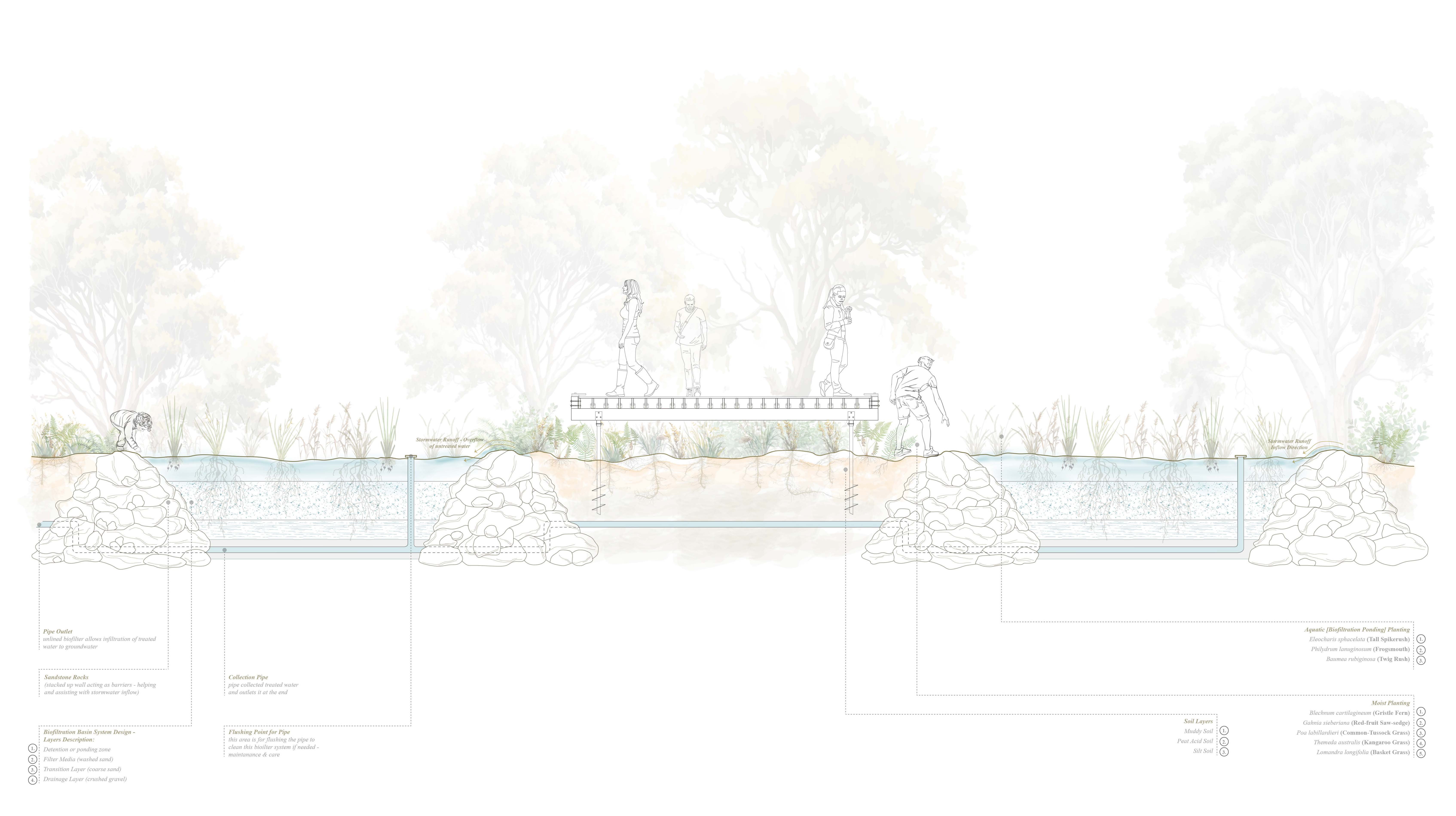 Working with the community, Swamp Studio 4 explores the entangled relationships between architecture, landscape, and hydrology. Through fieldwork, design research, and collaboration with Gully Traditional Owners and Blue Mountains City Council, we develop interventions that support the swamp’s ecological and cultural resilience. Working at multiple scales—from catchment to habitat—we design structures, remedial interventions, and new ways of living with wet ground.